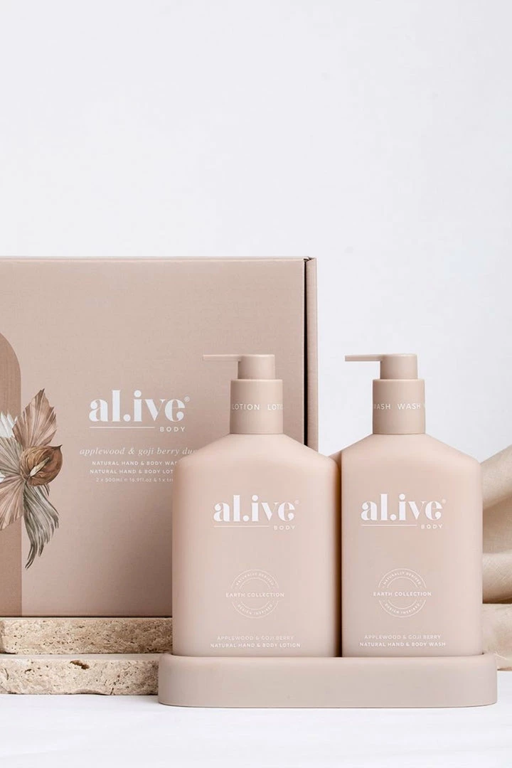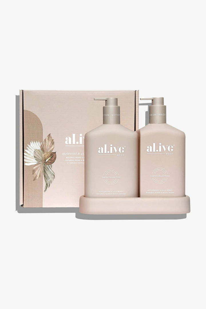 The Al.ive Body Applewood & Goji Berry Hand & Body Wash/Lotion Duo contains a luxurious blend of naturally derived ingredients, fortified with essential oils and native botanical extracts. The Duo includes a 500ml hand & body wash, 500ml hand & body lotion and a matching tray.