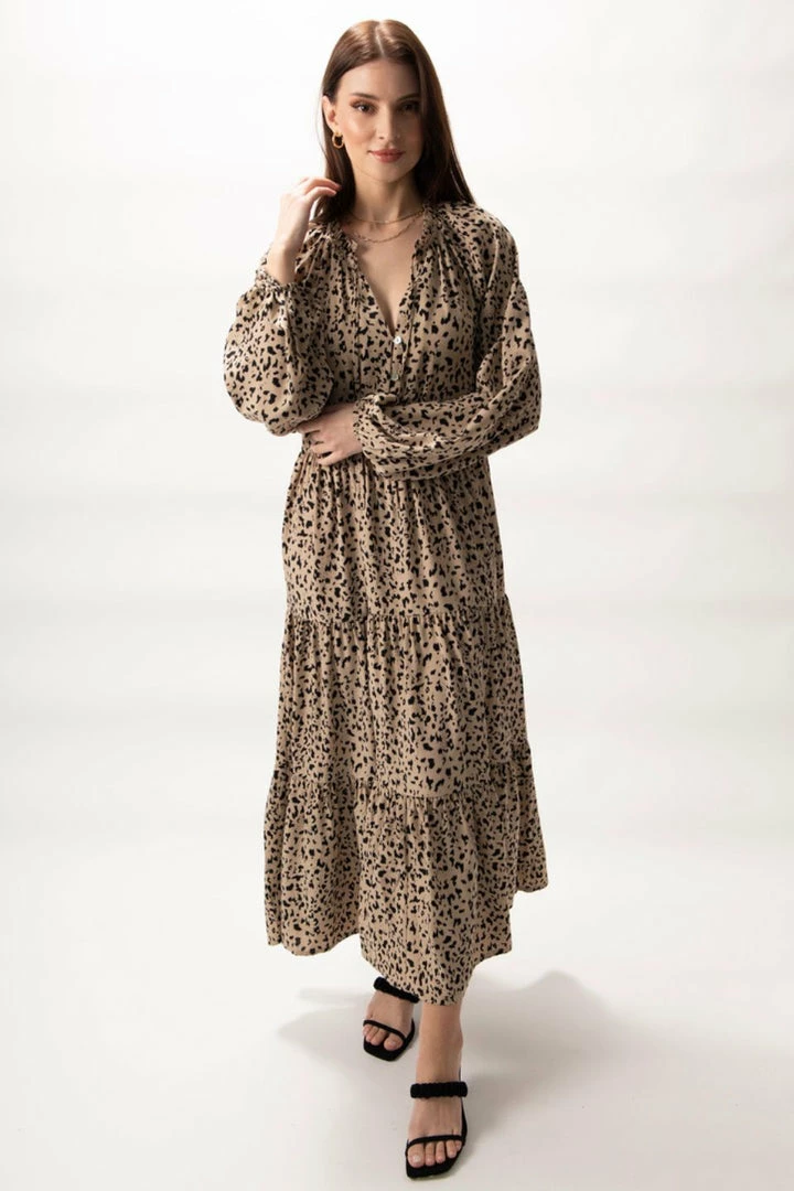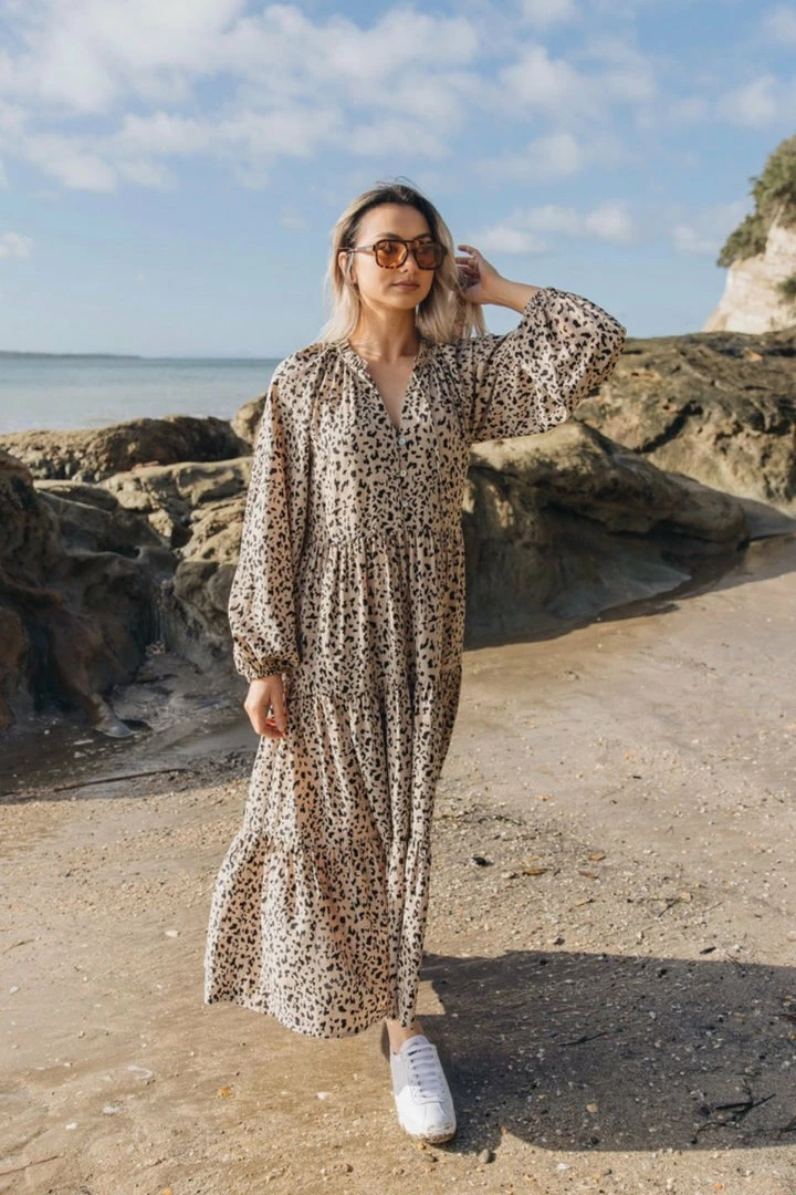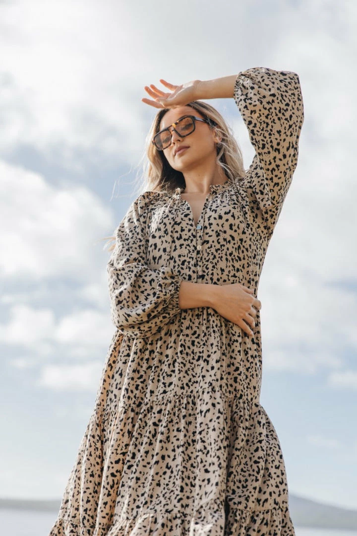 The Aida dress from Among the Brave features a fun animal print with long puff sleeves. This dress is perfect for a long lunch, We love to style this piece with boots and a leather jacket. Or dress it down with sneakers and a denim jacket.