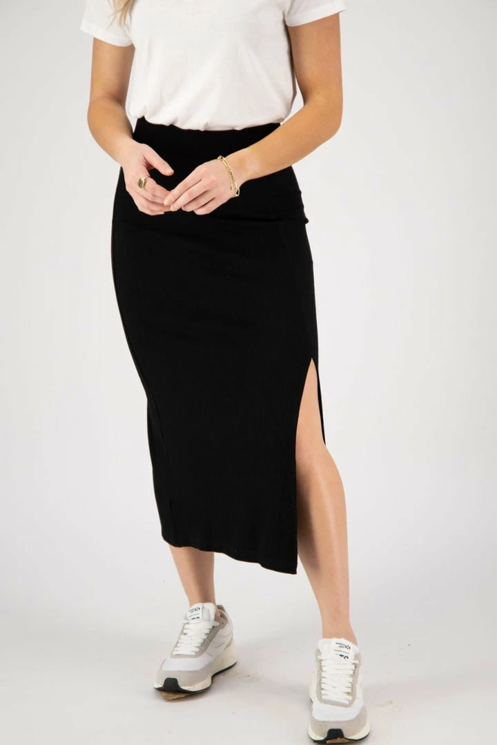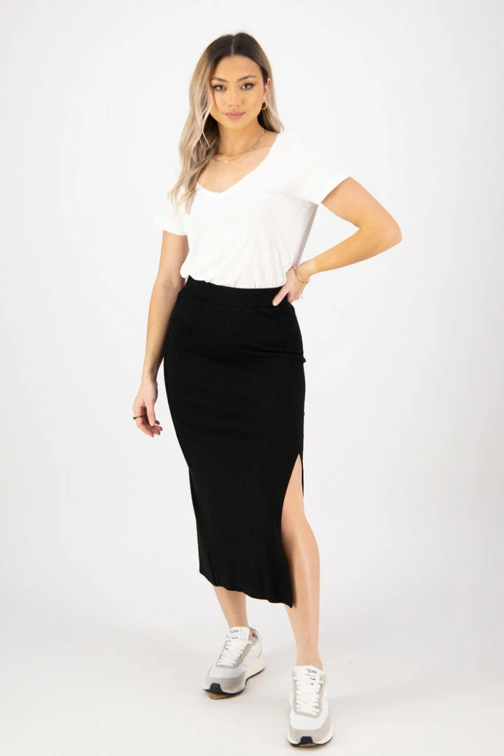 The perfect rib knit midi that you need in your wardrobe. Introducing the True skirt by Among the Brave easily paired with a white tee and sneakers for a chic on the go fit.