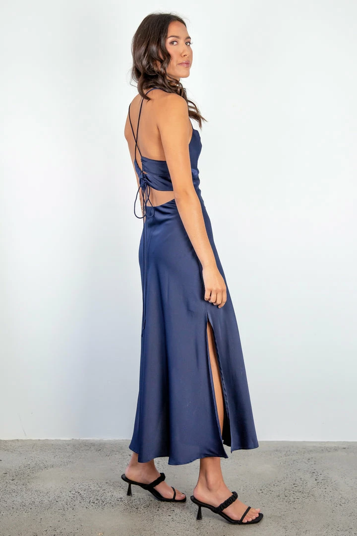 This Navy Satin Midi dress is perfect for all occassions! Dress it down with a sneaker and denim jacket or dress it up with your best jewellery and some heels. You’ll be ready to take on anything! Featuring a cowl neck, leg slit, and beautiful tie back all creating a beautiful silhouette.