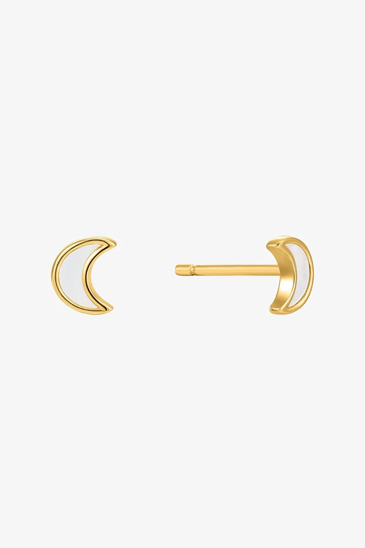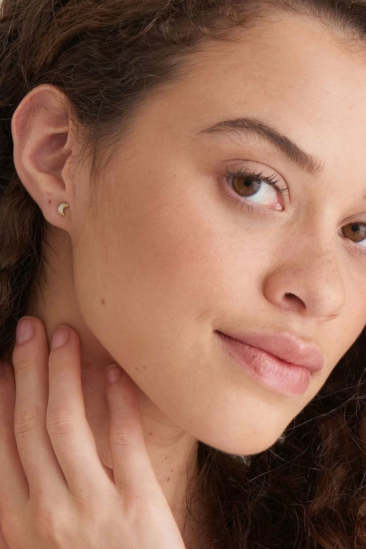 Minimal and chic but with a bohemian twist, try these delicately crafted moon stud earrings this season. The inner moon is crafted with the perfect iridescent mother of pearl for a subtle light-reflecting finish.