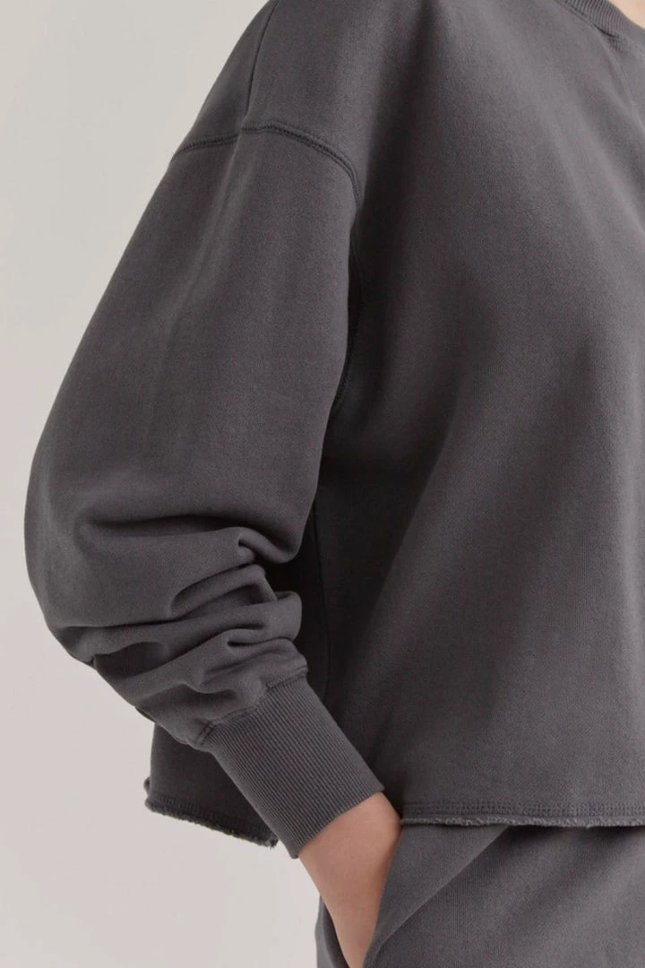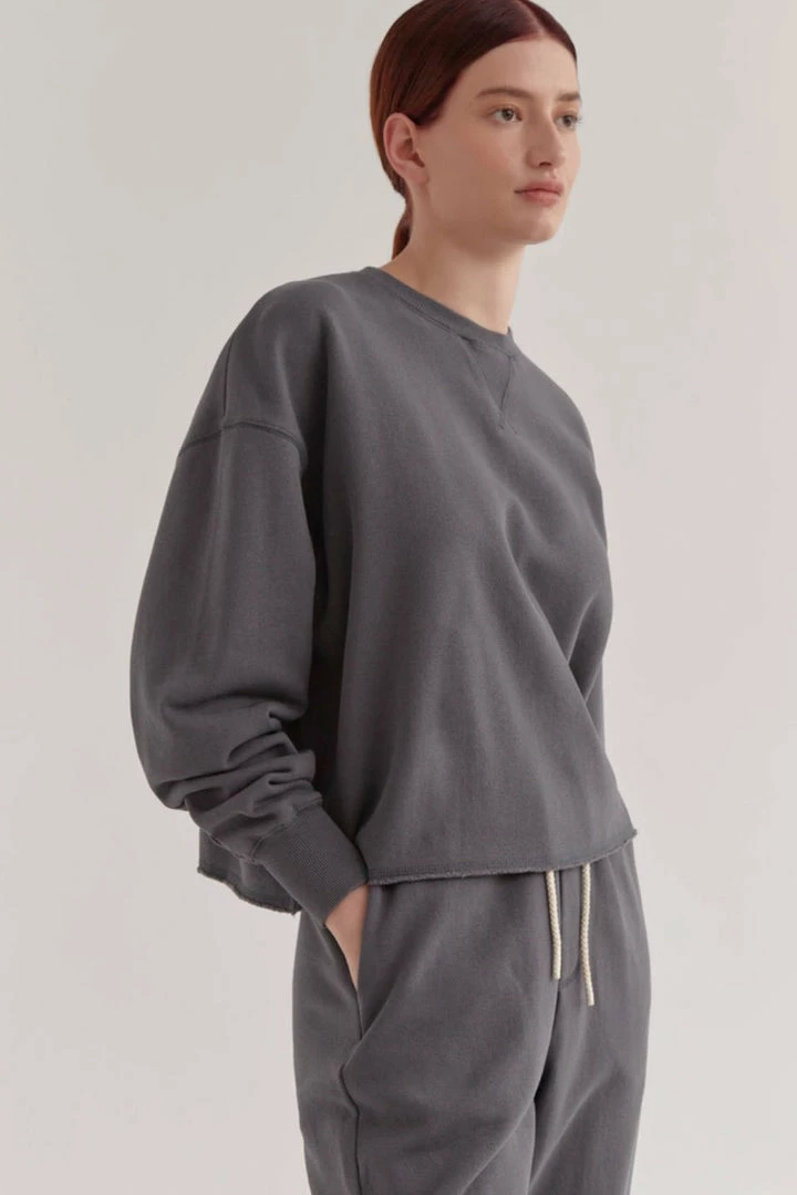 The Jorja Cropped Sweat is a new lightweight cut for trans-seasonal dressing and lounging, crafted from soft cotton terry. This piece has a relaxed fit with a raw hem, ribbed cuffs and collar, finished with V stitching at the neckline.