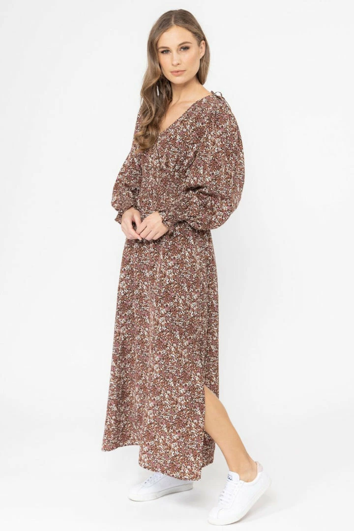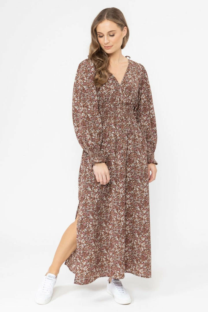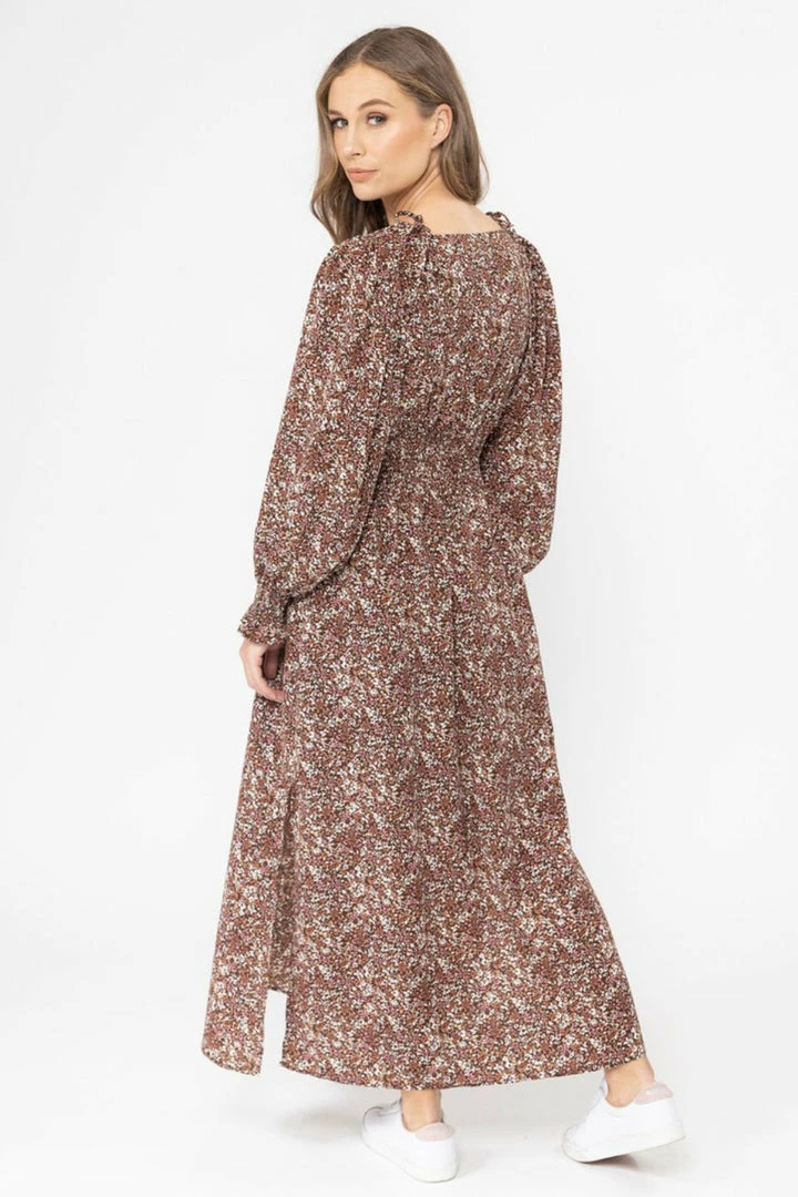 Billie The Label Skilful Brown Floral Shirred Waist LS Maxi Dress