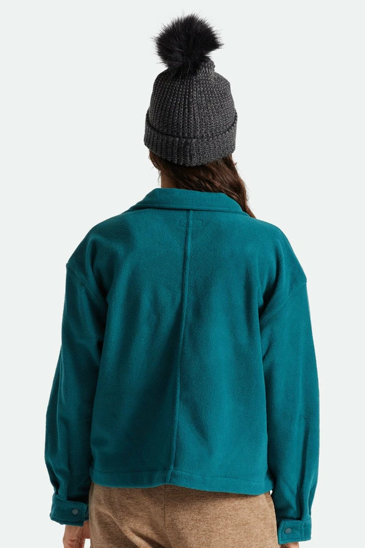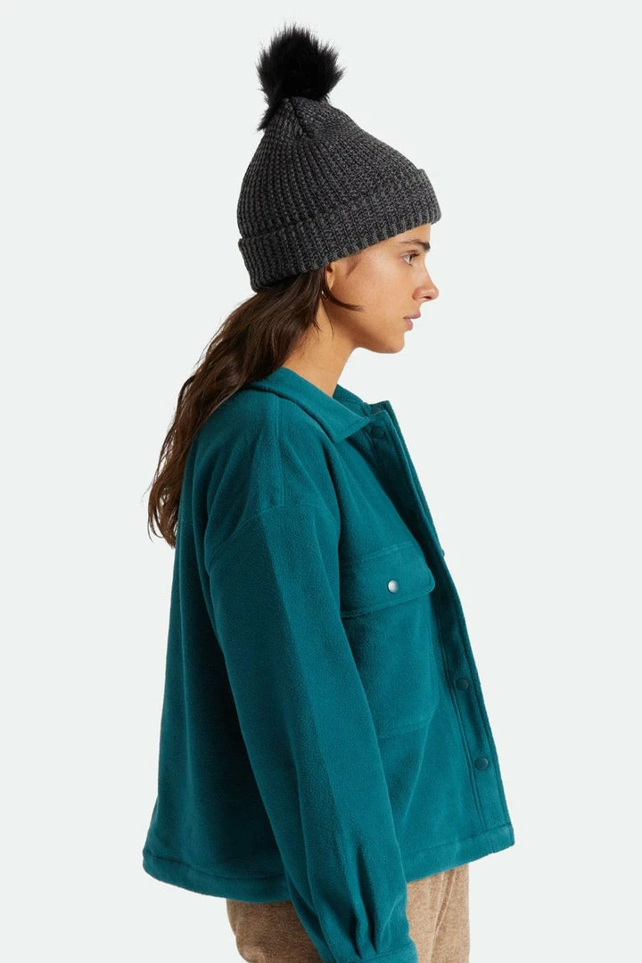 A 100% acrylic 1×1 heavyweight knit beanie with a debossed-leather Brixton label at cuff and faux-fur pom at top of hat.