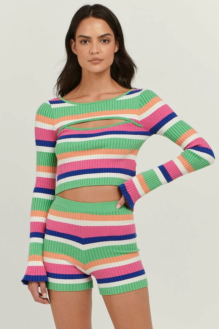 A central cut-out feature gives this bell-sleeve top a sexy highlight. Team it with high-waisted flared jeans and platforms for a fun ’70s look.