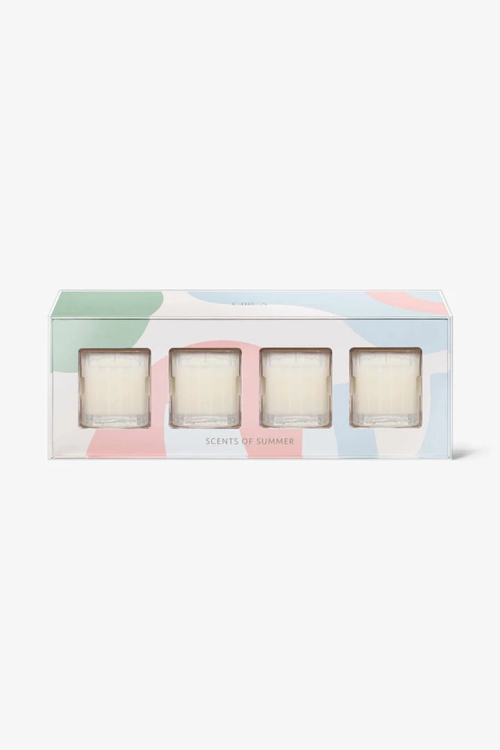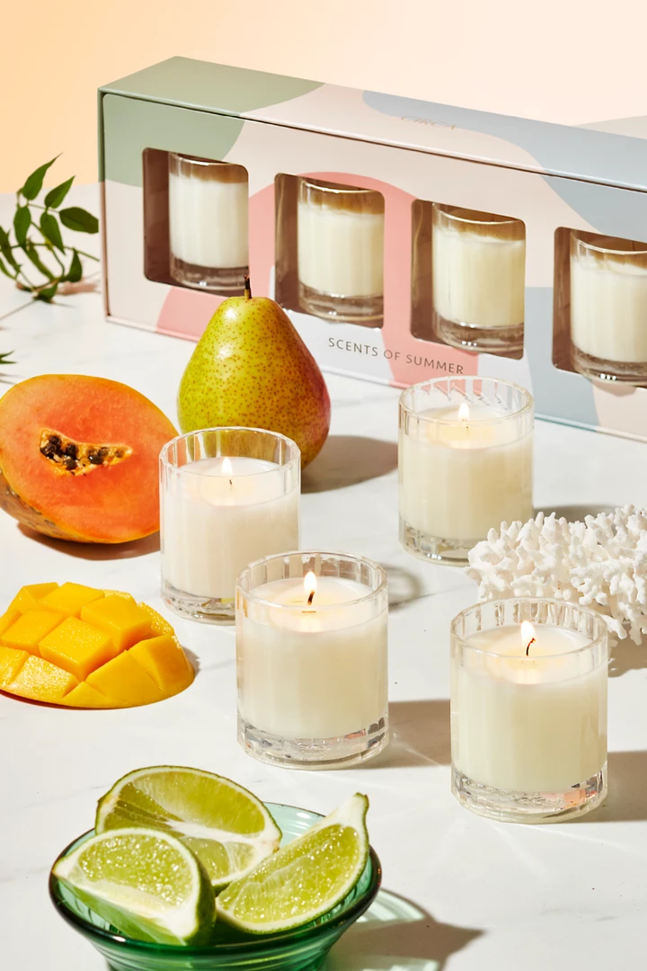 Contains 4 x Soy Candles 60g: Oceanique, Jasmine & Magnolia, Mango & Papaya and Pear & Lime