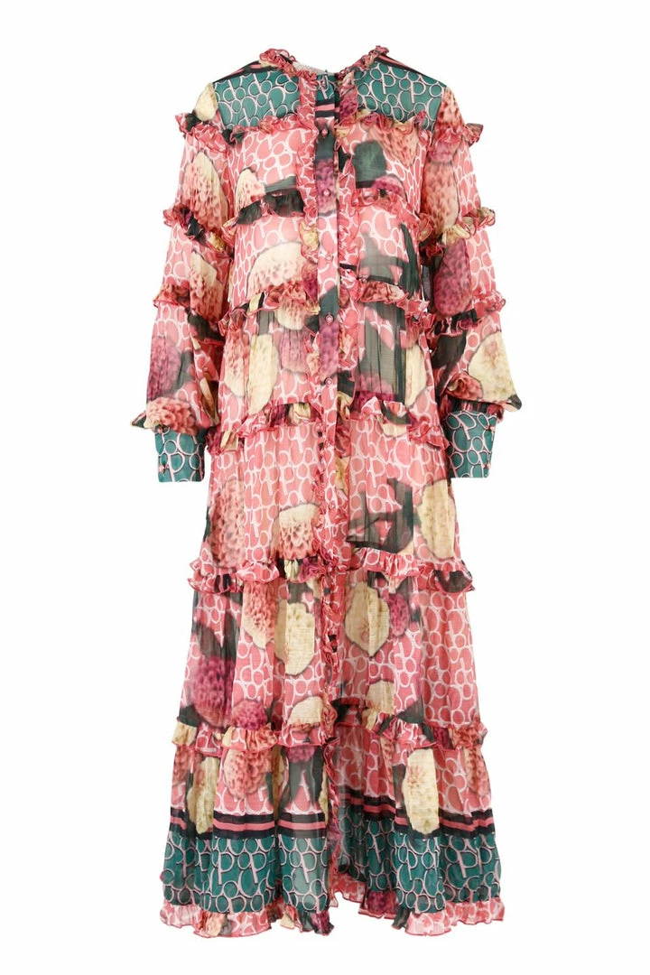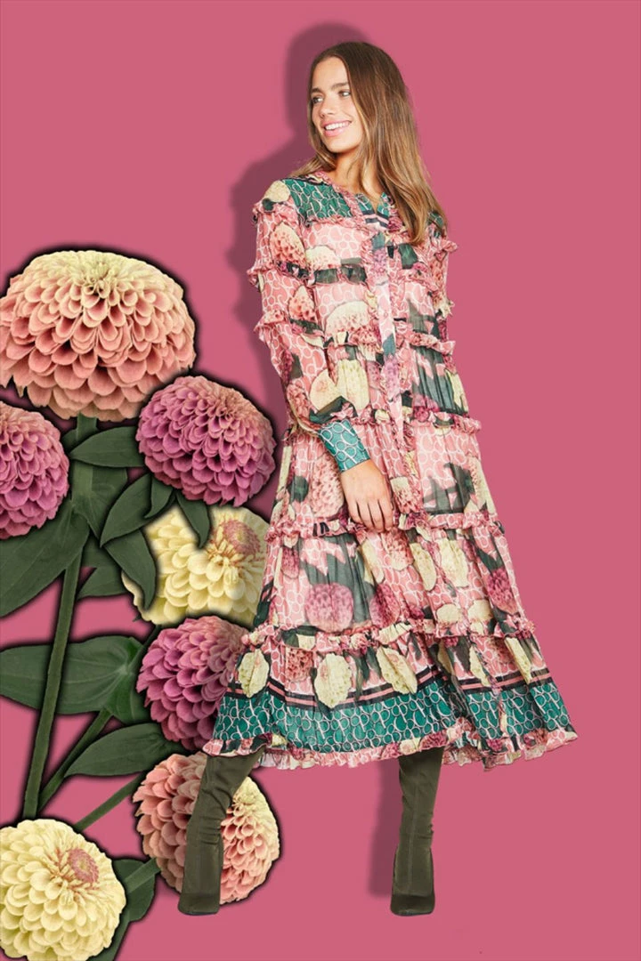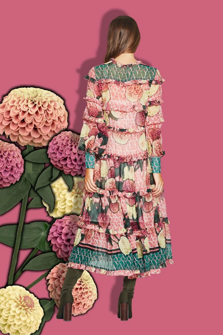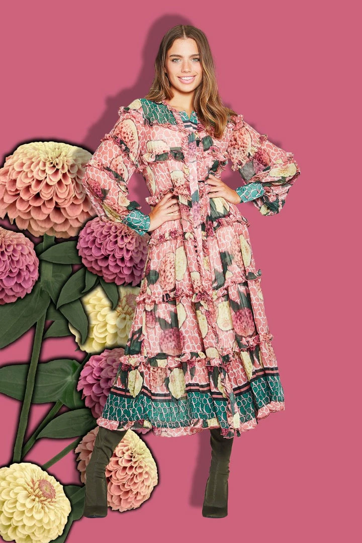 Coop Fashion Hang In Tier LS Frill Pink Zinnia Garden Midi Dress