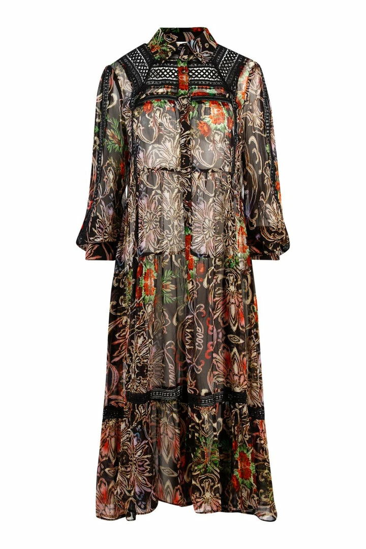 Designed in the ‘Moonflower’ viscose yoryu, an intricately patterned print that stands out against a black background. The ‘State of Lace’ tiered maxi dress features stunning lace inserts, a classic collar and button through front. This is an effortlessly elegant everyday to evening dress.