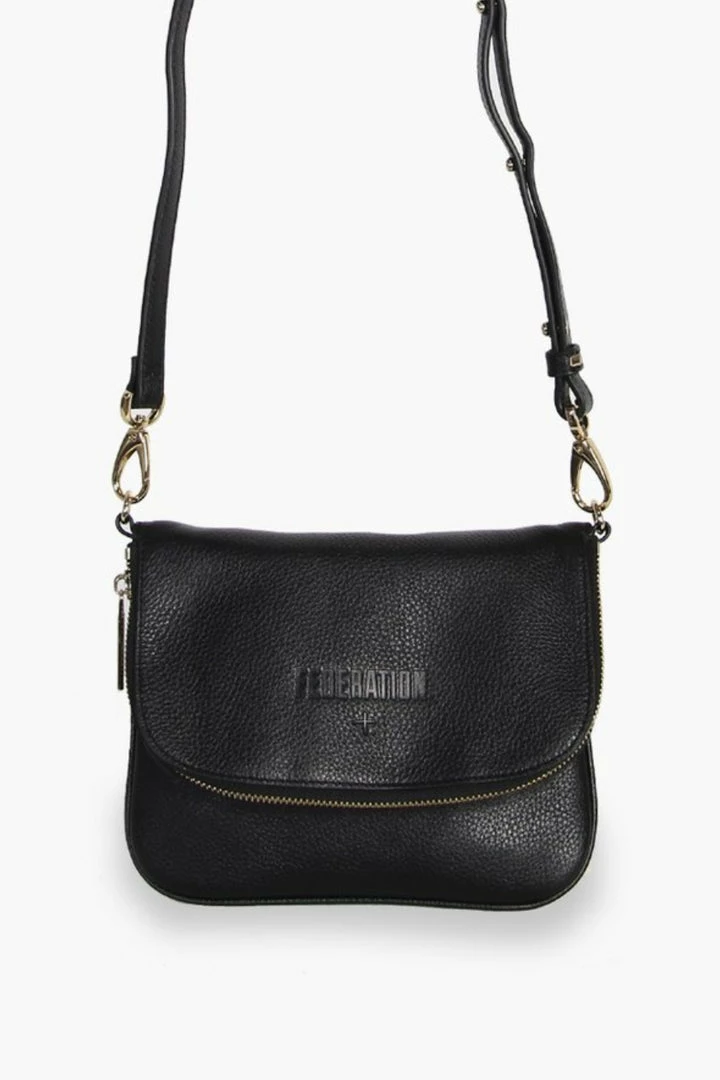 Soft pure leather in just the right size to have all your necessities. Gold zip and hardware detailing and adjustable strap.