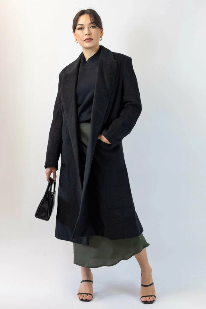The Sliced Trench has low buttoning detail at the front and double jet pockets. On the sleeves it has invisible zips that can unzipped for a split up to 20cm. The back has two splits.