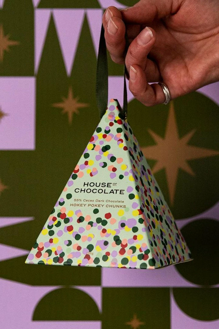 One of a kind Hanging Box filled with Hokey Pokey Chunks. Inside the box is our handcrafted Honeycomb laced with J.Friend & Co Beechwood Honey, dipped in min 55% Couverture Dark Chocolate. All packaged in our new custom made triangle spotty print box finished with gold embossed logo and House of Chocolate Christmas Ribbon.