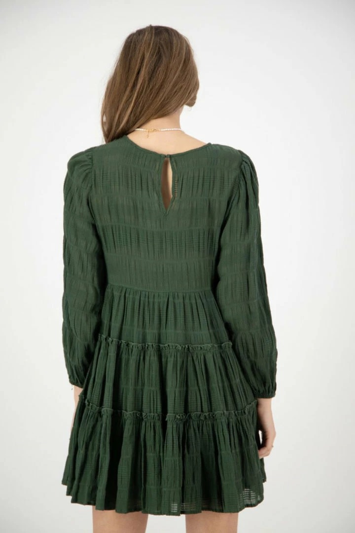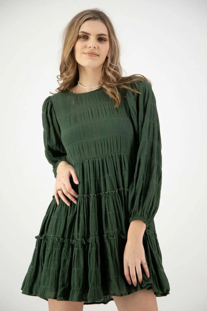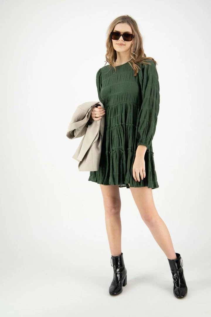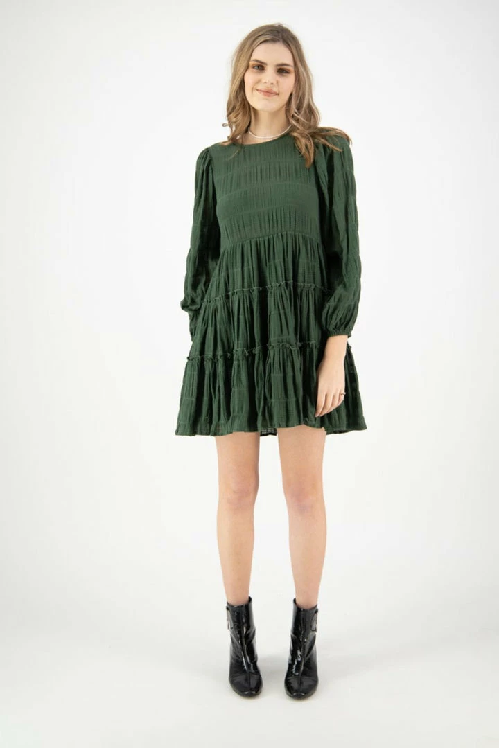 Ivy + Jack Fashion Luca Hunter Green Shirred Cotton LS Tiered Smock Dress
