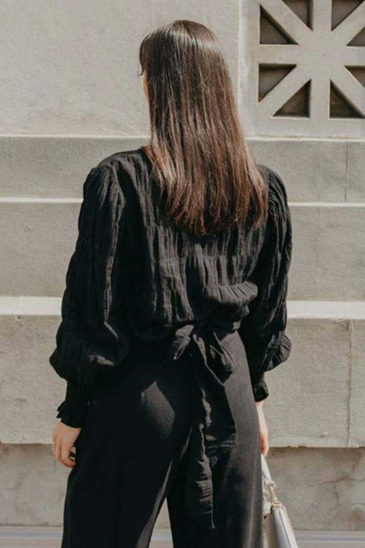 Your new go-to blouse is here! Our heavenly Grace top features long balloon sleeves with fitted cuffs and a tie up back. Easily dressed up with dress pants and heels or worn more casual with jeans and sneakers.