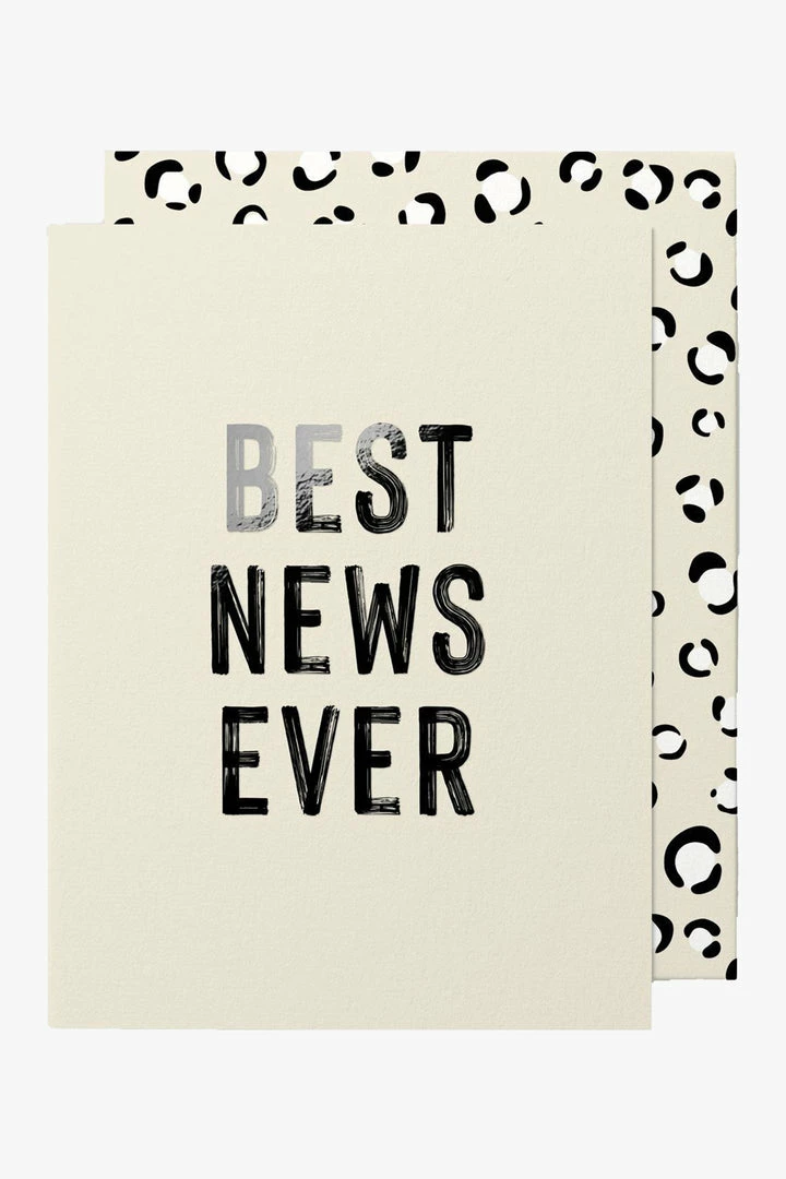 Celebrate that special occasion with this Best News Ever greeting card. Finishes: Black foil. Stock: 350gsm kraft recycled paper. Size: 90 x 120mm. Inside: Blank. Envelope: Ivory and leopard spots on uncoated 100% recycled paper.