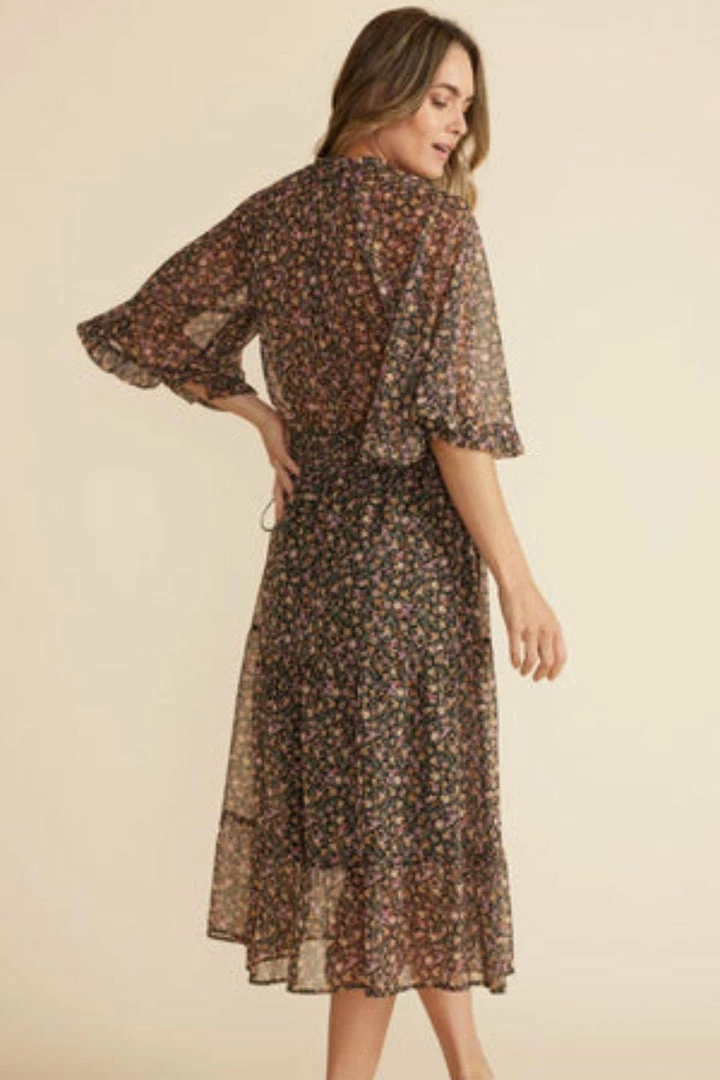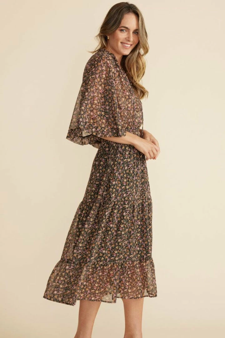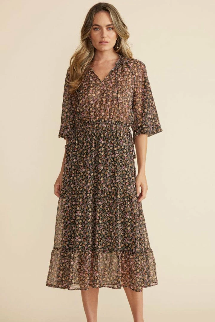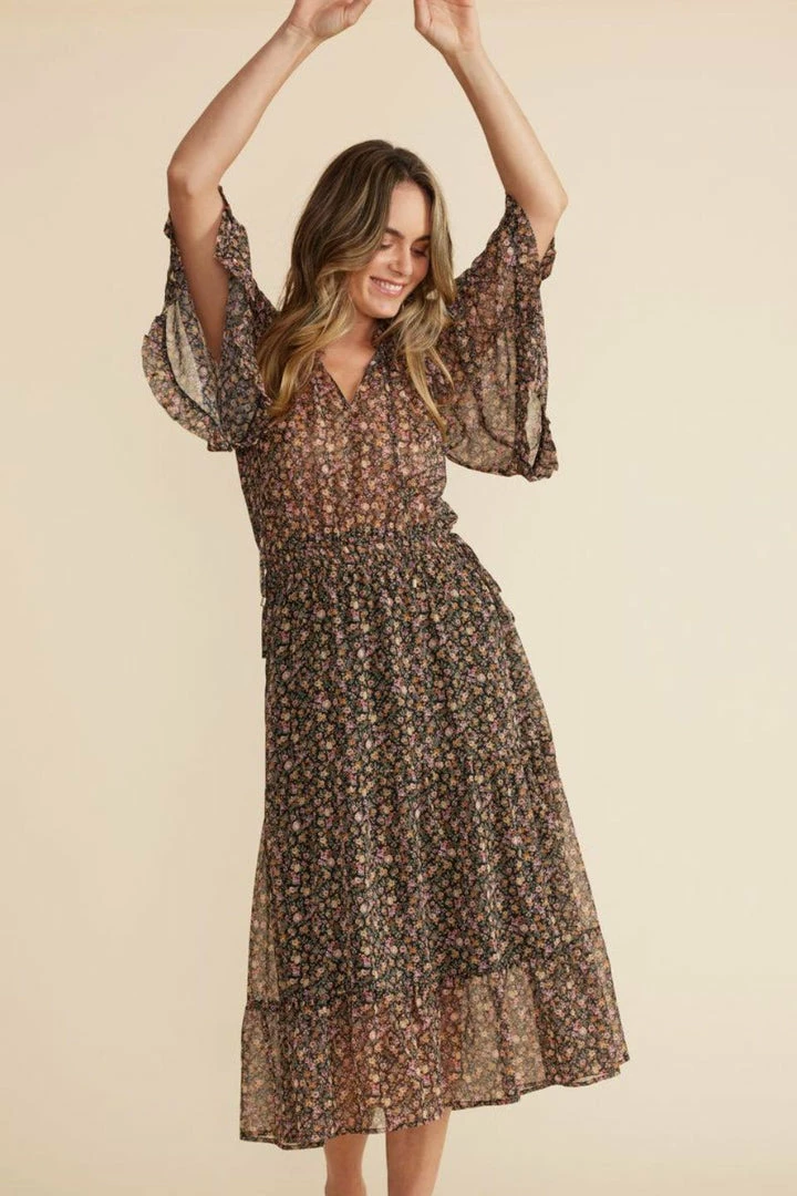 A best-selling shape with a seasonal floral update, the Amaya Midi Dress features a flowing silhouette, a ruched open collar, a drawstring waist with side ties, and a tiered skirt.