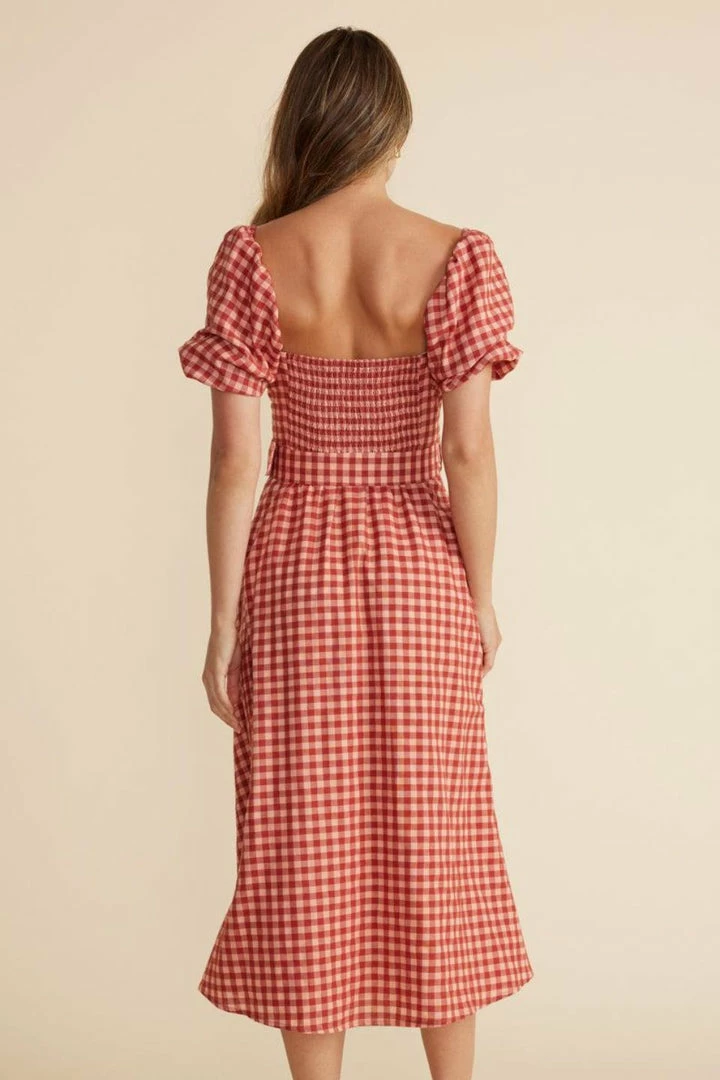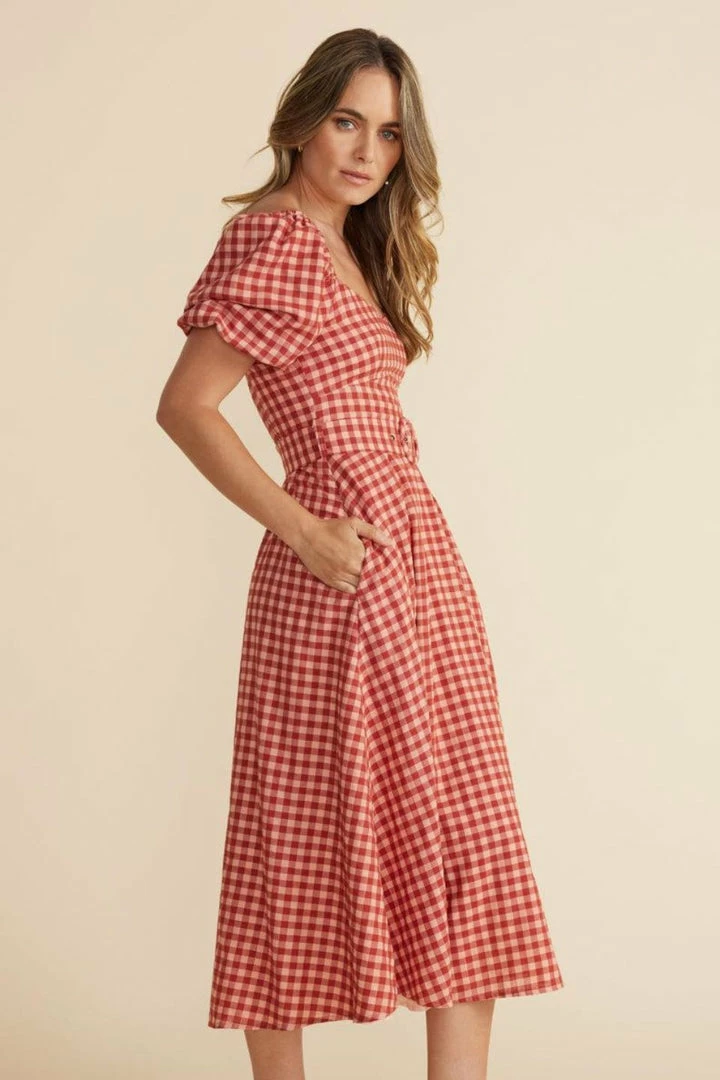 Featuring a sweetheart neckline, flared skirt and elasticated puff sleeves in a stunning gingham print, the Cora Midi Dress is a dream come true for your next outdoor event.