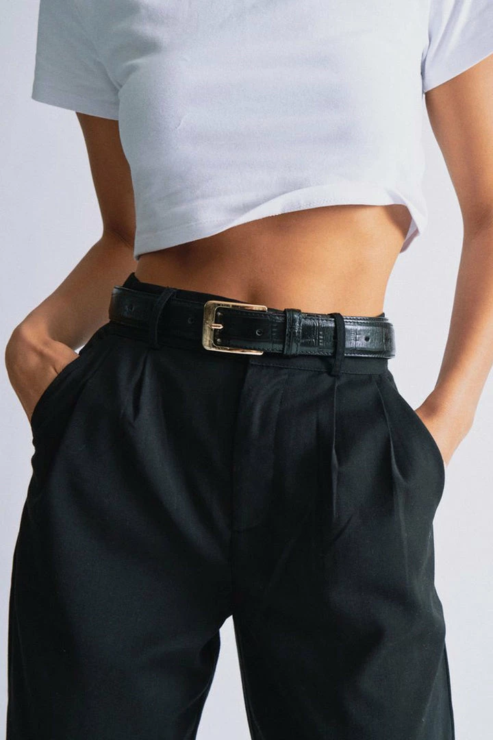 The Mia Black Croc is an ode to that vintage belt you’ve always searched for. Punctuated with a silver buckle, it has a slim shape that’s easy to thread through the loops of your denim jeans. Wear yours with tailored pants and a basic crop for your next lunch date!