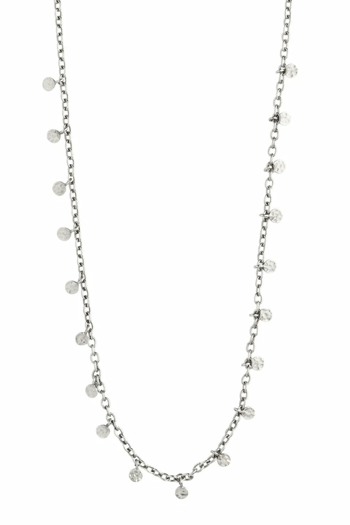 Feminine silver-plated necklace with small round polished pendants along the chain. The delicate necklace is 40 cm long with a 9 cm extension chain. The design was inspired by classic exotic jewellery, and the necklace is the perfect contrast to an edgy outfit. Let your femininity shine through with this charming classic.