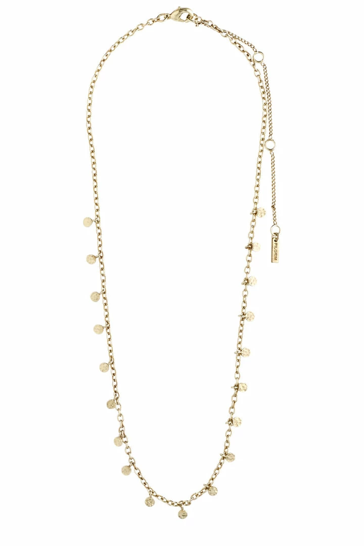 Feminine silver-plated necklace with small round polished pendants along the chain. The delicate necklace is 40 cm long with a 9 cm extension chain. The design was inspired by classic exotic jewellery, and the necklace is the perfect contrast to an edgy outfit. Let your femininity shine through with this charming classic.