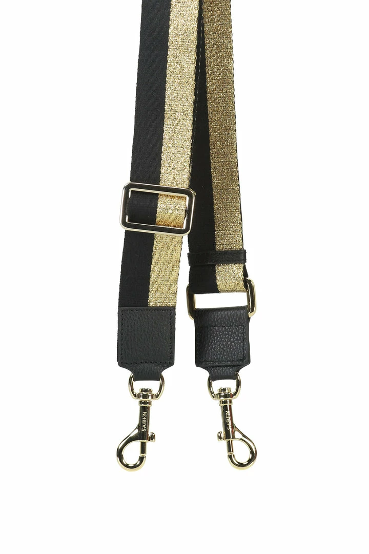 Transform any bag with our new dual colour strap. Black and metallic gold cotton webbing with black leather trim.