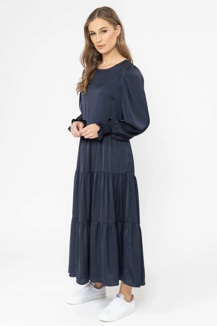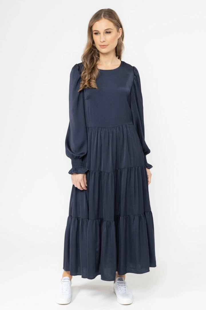 Seeking Lola Fashion Day Dream Navy Satin LS Tiered Midi Dress