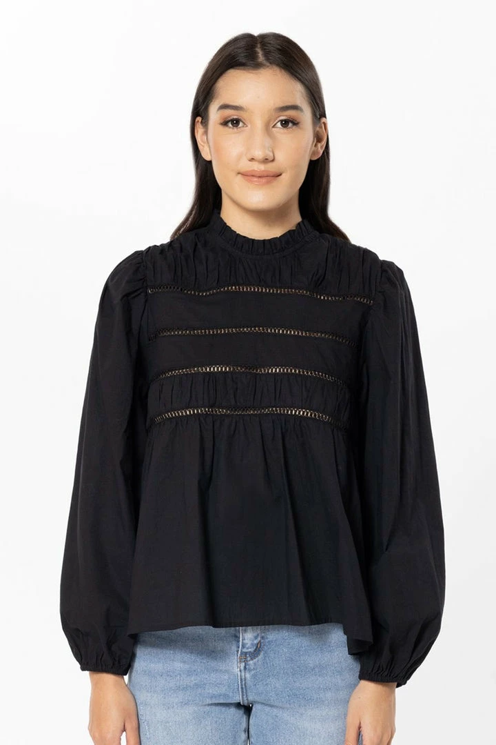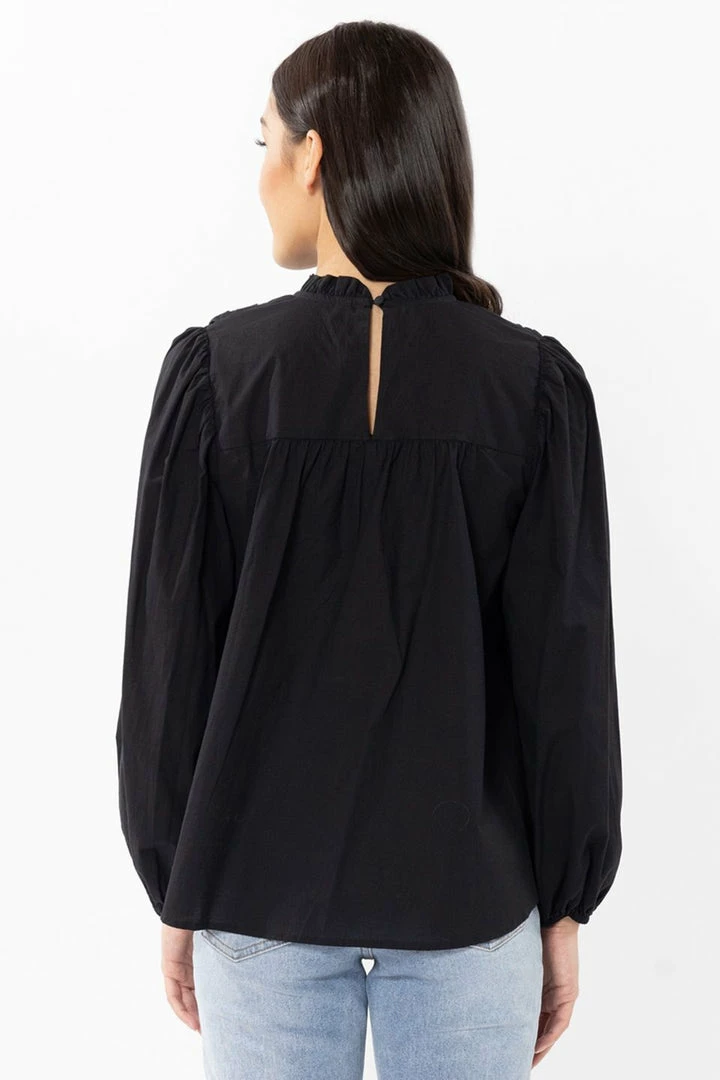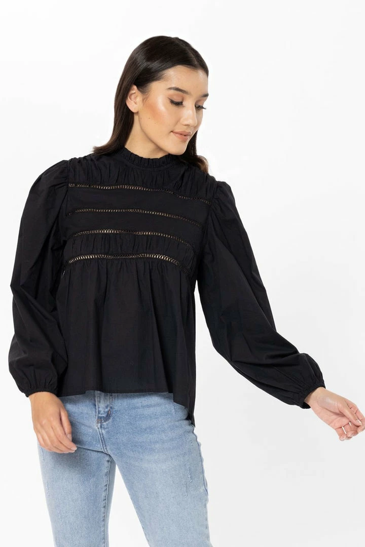 We are in love with the Desire black top by Seeking Lola. Featuring a gorgeous high neckline and puff sleeves, This top will make a statement paired with your favourite jeans and heels for your next dinner date out.