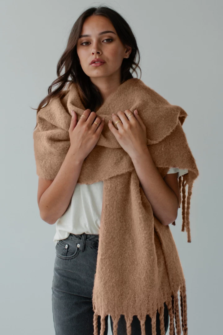 The softest scarf you’ll own. Blanket style scarf with a statement fringe in a classic earthy hue.
