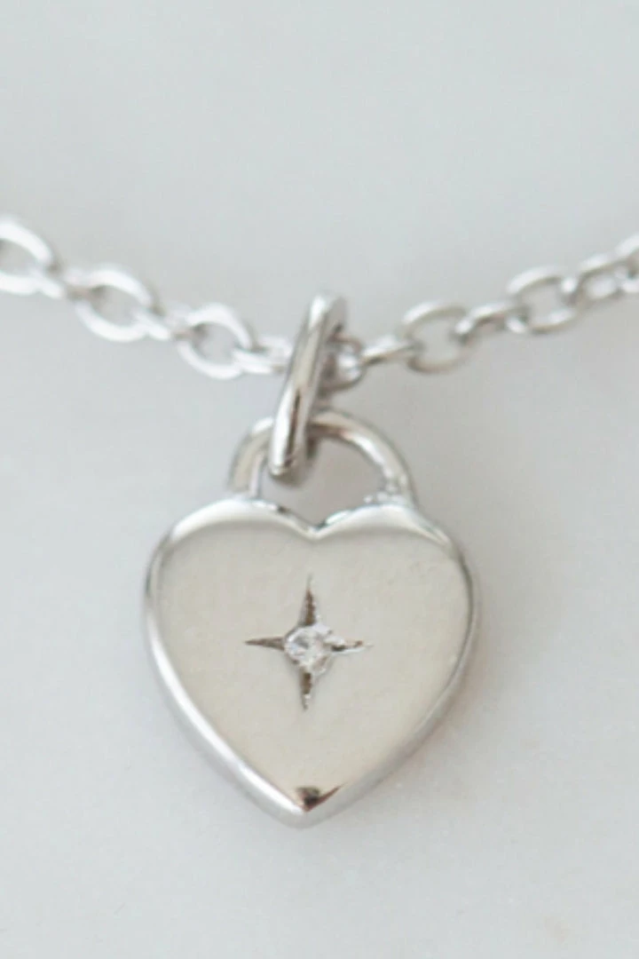 A fine chain featuring a heart pendant w. a clear zircon. A simple look on its own and is just as nice layered with other pieces. Our latest crush!