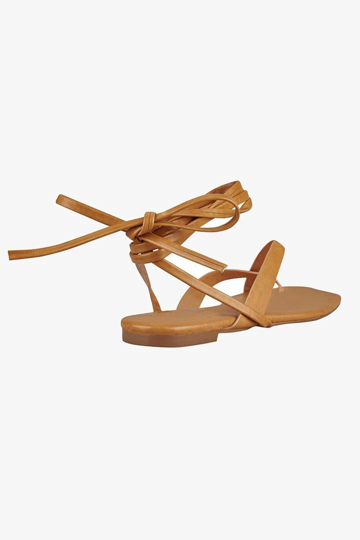 The Stormy sandal is all straps, all day. Two tan straps wrap the foot before extending upwards to secure the ankle and finish with a bow!