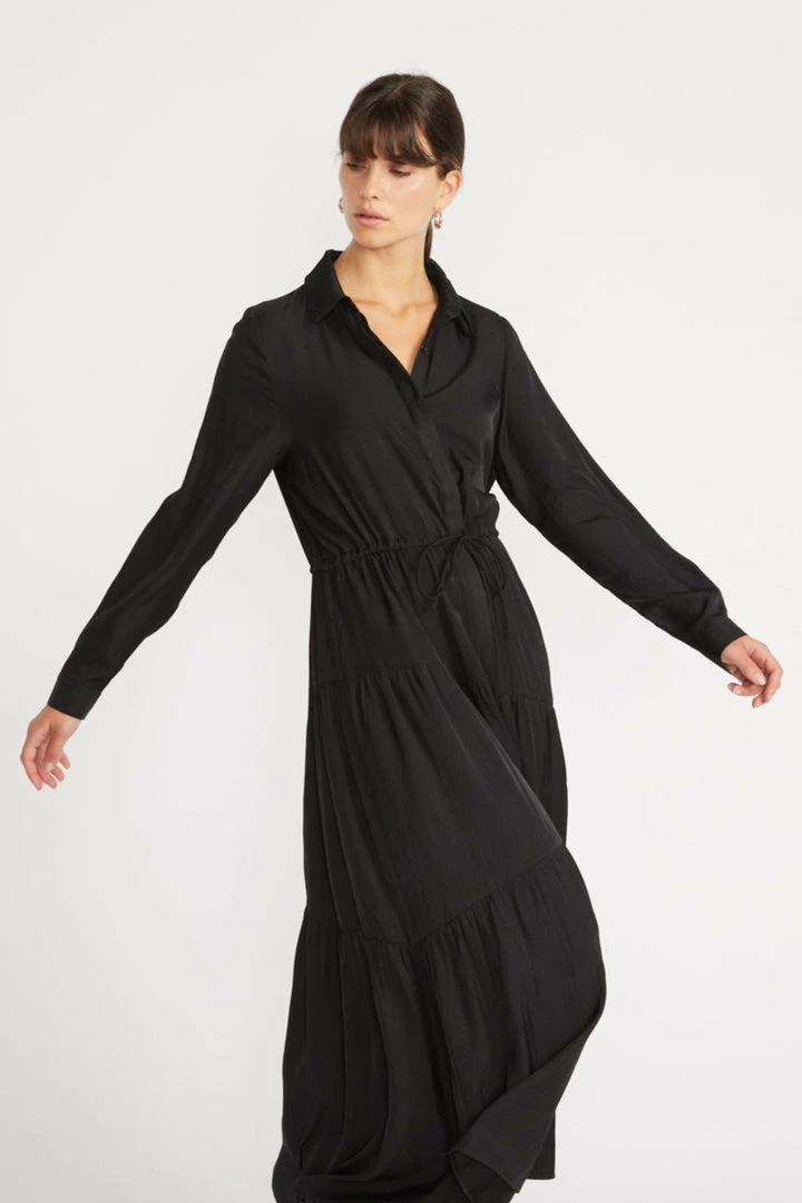 The Stevie Shirtdress is a longline midi style dress, with a functional button front, drawstring waist, and asymmetric tiers. Finished in a silk-like, easy-to-care for fabrication.