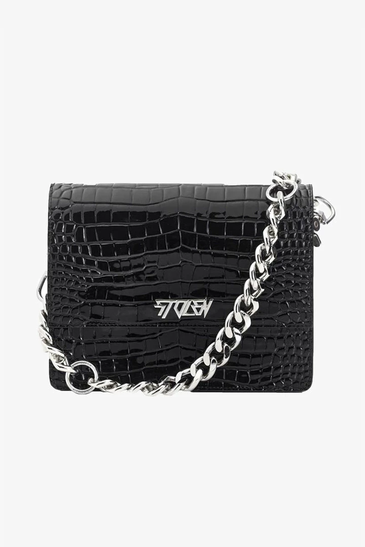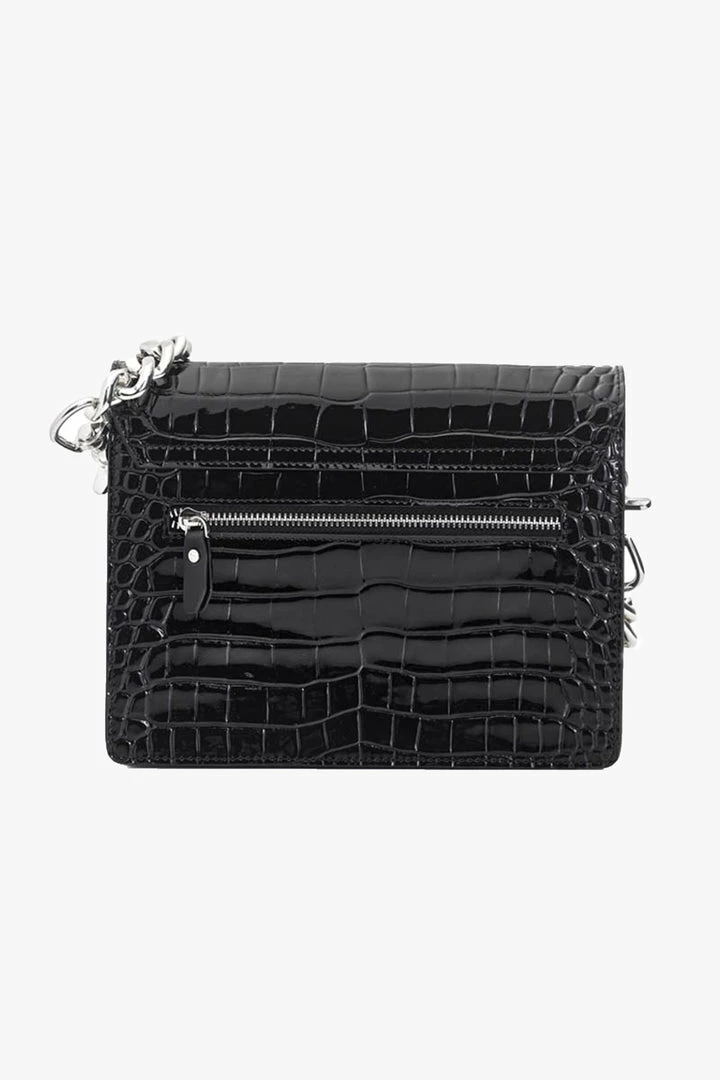Designed with sharp corners, cleaner lines, and angular features, this style has more structure and feels almost architectural. Beautifully crafted in rich crocodile-effect texture, this has a modernized high-sheen leather and chunky silver hardware.