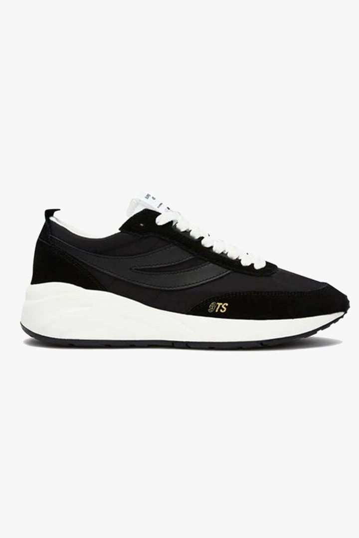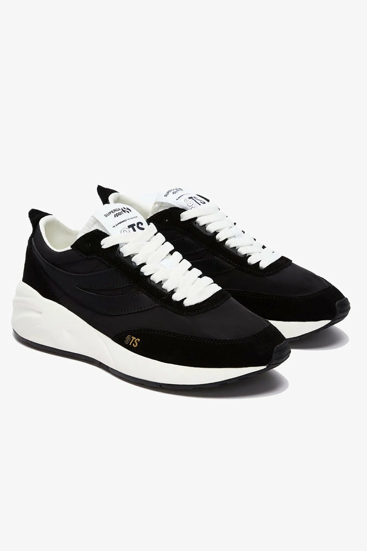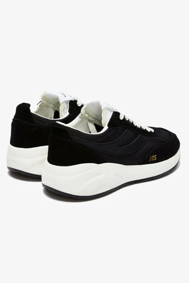 Our updated and improved slim 9TS is made from 100% Recycled nylon from PET and suede leather. The tongue shows an unlined sponge padding, a classic detail of the 90s retro-running heritage sneaker. Featuring our heritage sports patch logo on the tongue, 9TS gold foil branding on the outer and ”Superga Sport” on the sole. The midsole is made from EVA and outsole in rubber.